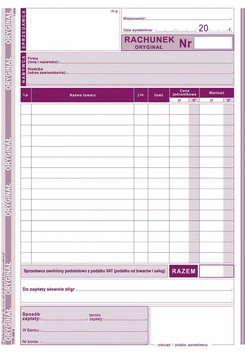 Druk samokopiujący A5 Rachunek dla zwolnionych podmiotowo z VAT 80k. Michalczyk i Prokop (233-3)