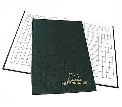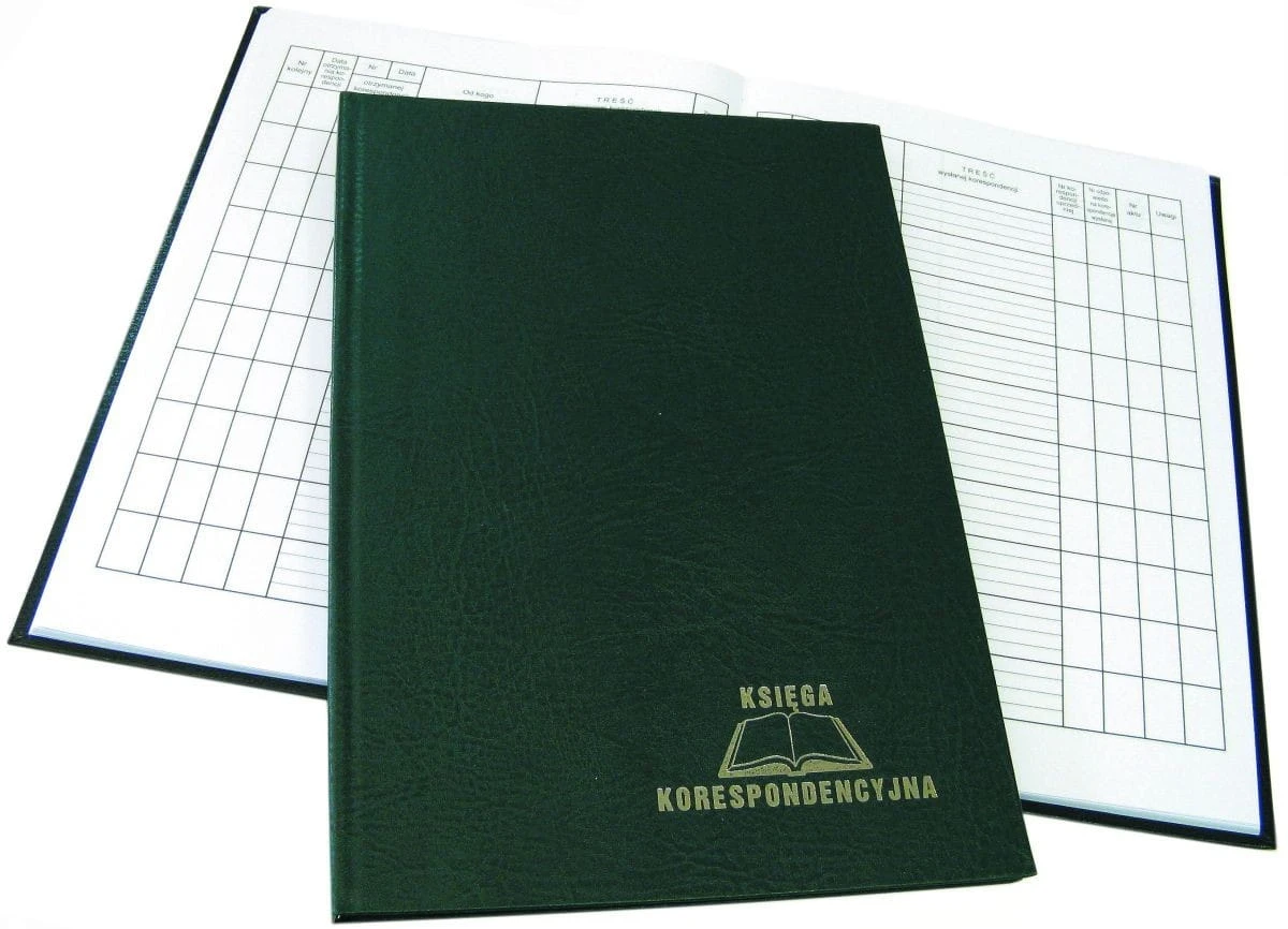 Książka korespondencyjna 192k?Format A4, okładka twarda, oprawiona w okleinę powleczoną PVC. ?Zawiera 192 karty z zadrukowanymi rubrykami, do umieszczania wpisów na temat korespondencji przychodzącej i wychodzącej.