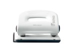 Metalowy dziurkacz biurowy z wykończeniami z tworzywa sztucznego. Posiada wskaźnik środka strony i ogranicznik formatu.