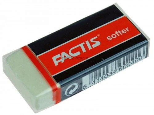średnia, syntetyczna guma "chlebowa" o doskonałych własnościach, w firmowej opasce zapobiegającej zabrudzeniom, do grafitów od 4H do 5B, uniwersalna, posiada indywidualny kod kreskowy, wymiary: 50x23,5x9,5 mm, produkcja : Factis, Hiszpania EAN: 8414034602406Kod Producenta: s 24seria: ChlebowaTyp: do ołówka.
