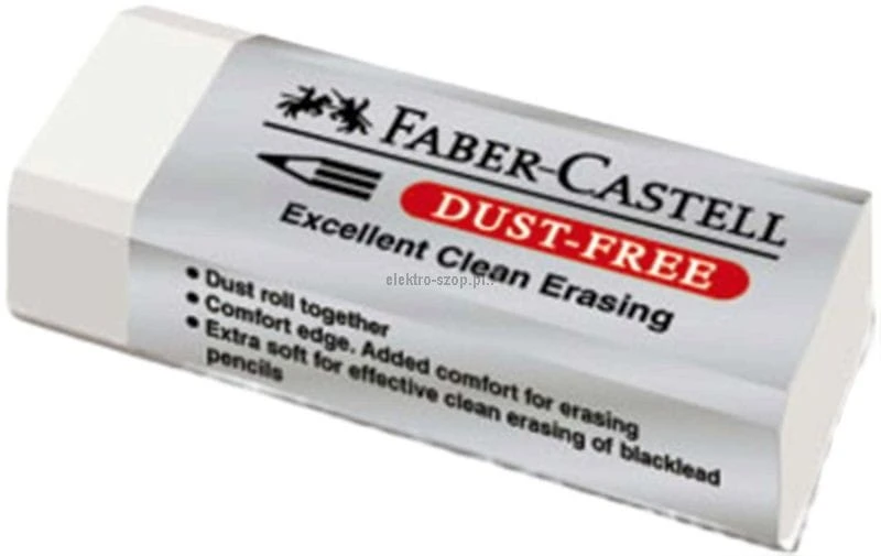 Gumka do wymazywania Dust Free Faber-Castell duża w kolorze białym w ochronnym opakowaniu. Zrównoważone połączenie tworzyw sztucznych powoduje, że wymazywanie nie zostawia smug.