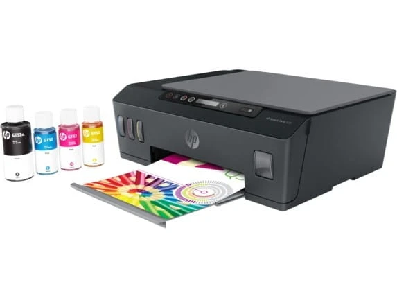 HP Smart Tank 500 3 butelki oryginalnego czarnego atramentu HP GT53XL, każda 135 ml Butelka z oryginalnym błękitnym atramentem HP GT52 Butelka z oryginalnym purpurowym atramentem HP GT52 Butelka z oryginalnym żółtym atramentem HP GT52 Ulotka ostrzegawcza dotycząca atramentu Ulotka dotycząca ponownego pakowania Instrukcja instalacji Instrukcja obsługi Ulotka dotycząca przepisów; Ulotka informująca o płycie PT Ulotka dotycząca przepisów RoH-EAC Przewód zasilający