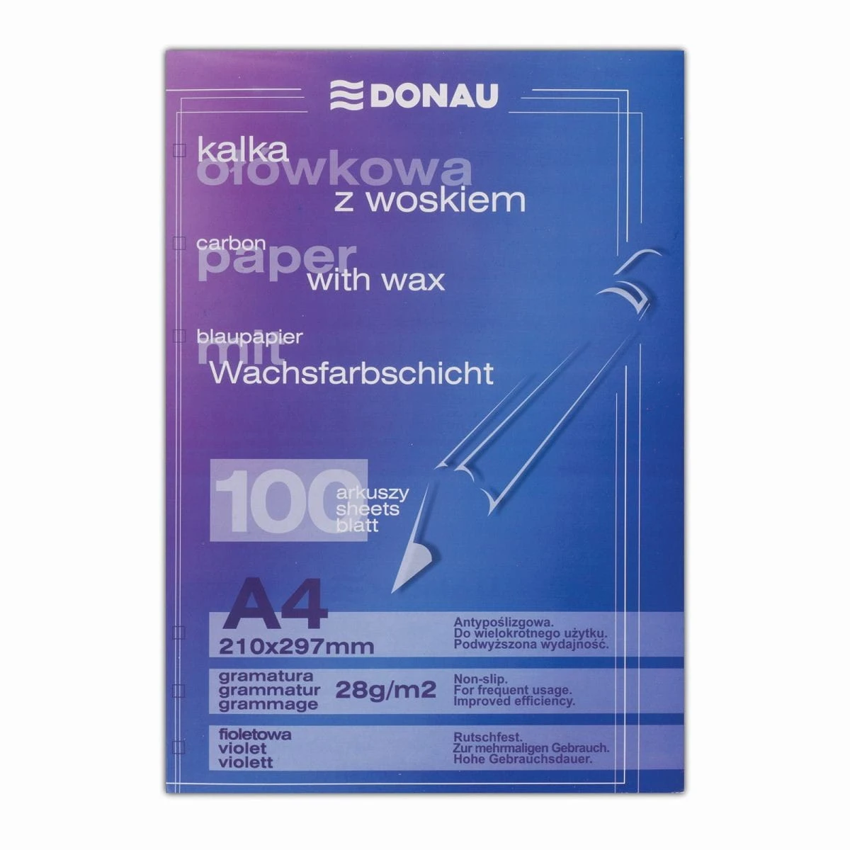 KALKA OŁÓWKOWA DONAU Z WOSKIEM, A4, 100SZT., FIOLETOWAjednostronnie powleczona masą barwiącąilość wyraźnych kopii wykonanych jednocześnie: 8-10 szt.