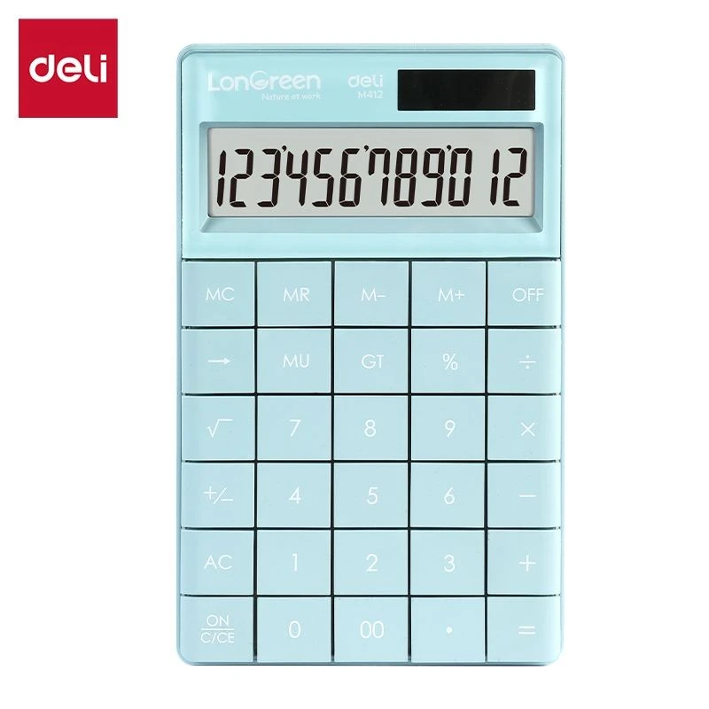 Kalkulator EM412 LonGreen posiada 12-cyfrowy wyświetlacz akrylowy w kompaktowej obudowie o wymiarach 165x103x16 mm. Wykonany z plastiku R-ABS pochodzącego z recyklingu, oferuje podwójne zasilanie (słoneczne + bateria LR44), automatyczne/ręczne wyłączanie i jest objęty 3-letnią gwarancją.