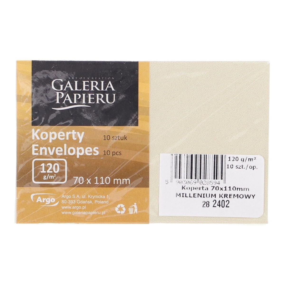 Koperta Millenium, format: 70 x 110mm, gramatura: 120g/m2, ilość: 10 sztuk w opakowaniu, dostępna również w kolorze białym, klejona na mokro, EAN: 5903069028594Format: C6Ilość: 10Kod Producenta: 282402Kolekcja: millenium krem kKolor: kremowa.