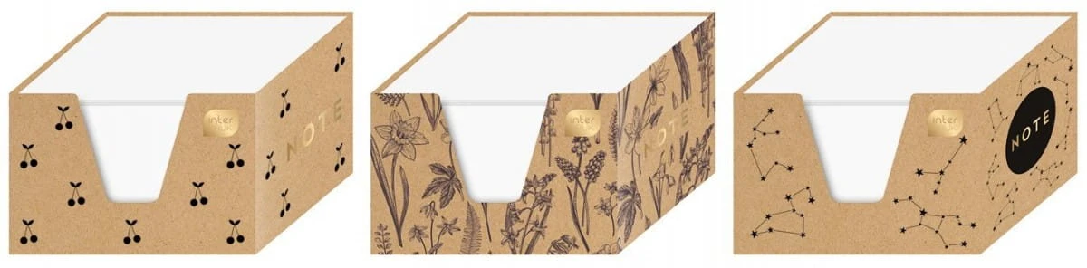Kostka papierowa biała o wymiarach: 90x90x90 mm; w kubiku z trwałego kartonu kraft o gramaturze 250 g ze złotymi detalami w technologii hot-stamping. Odpowiednia jako wkład do uzupełnienia pojemnika albo samodzielny bloczek do notowania.