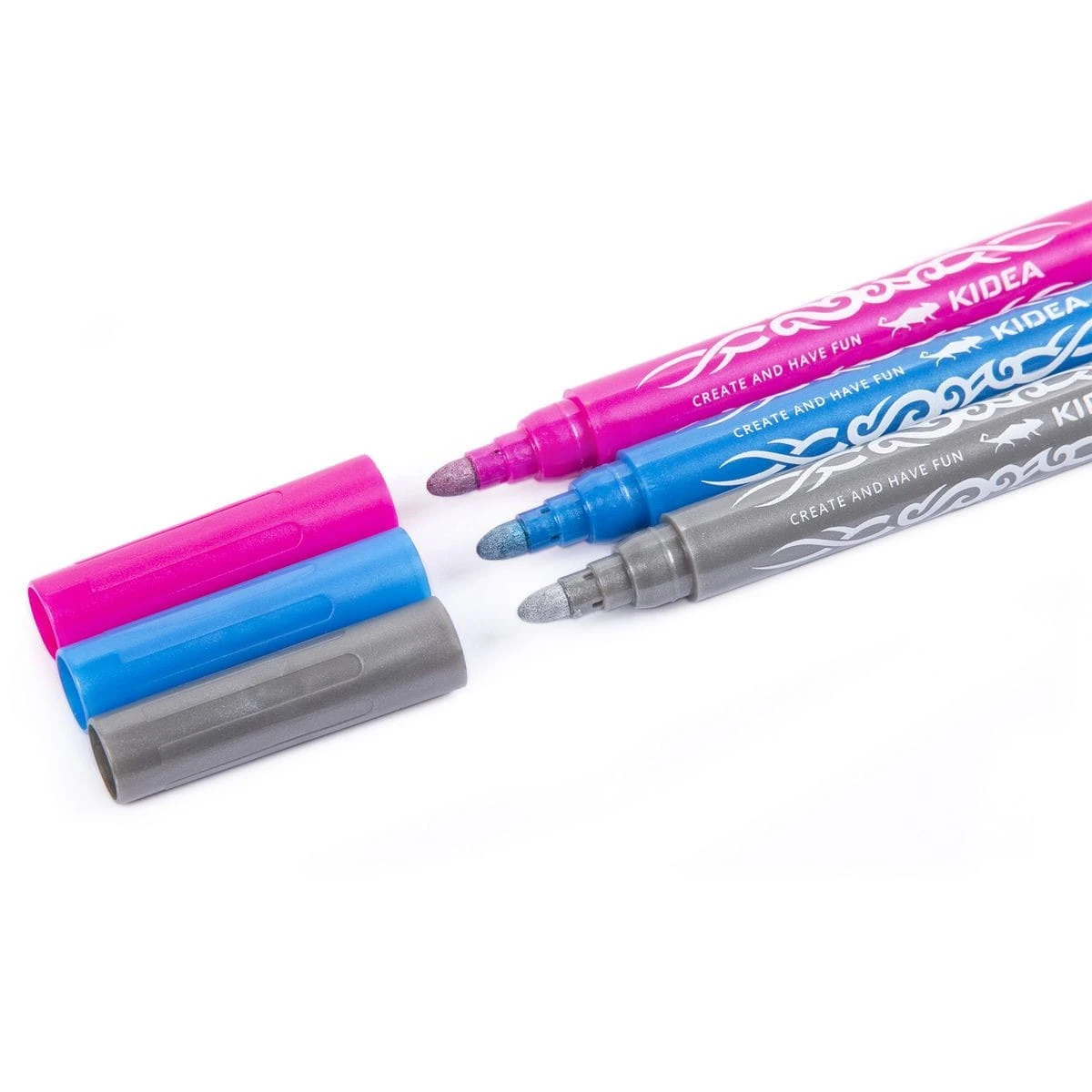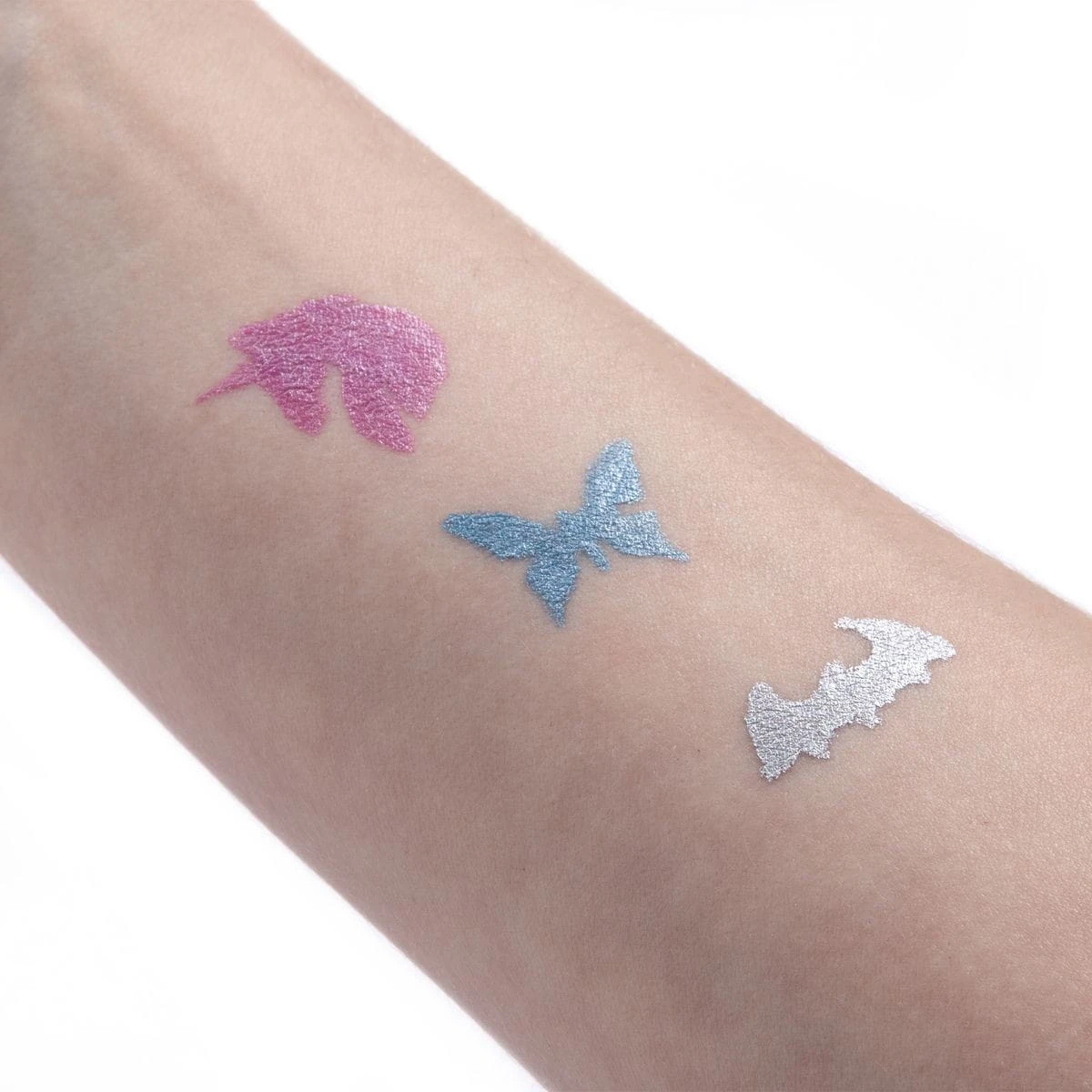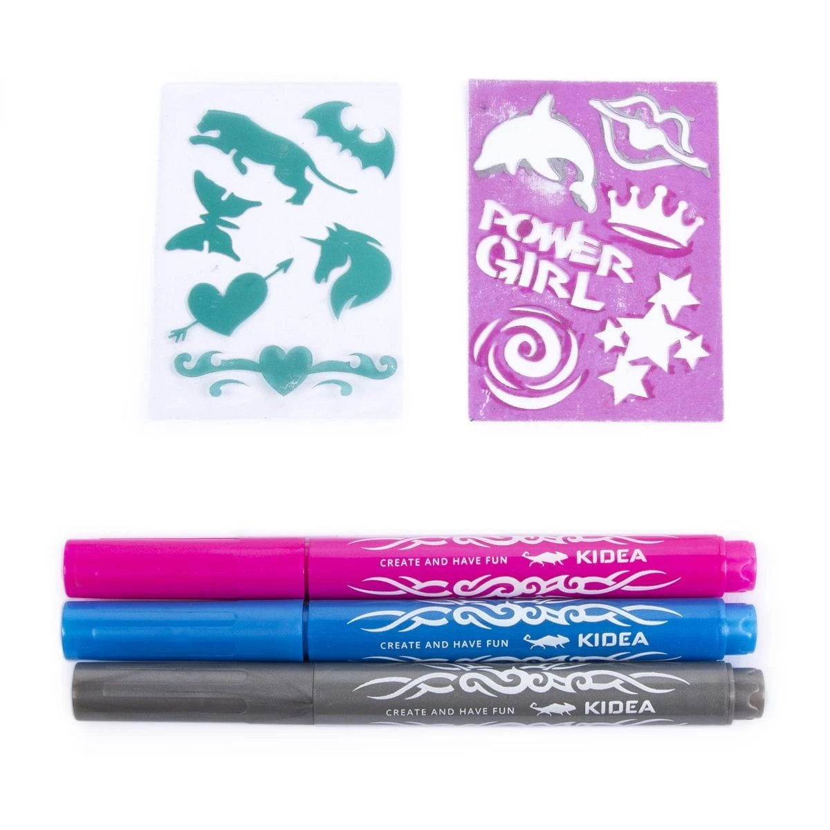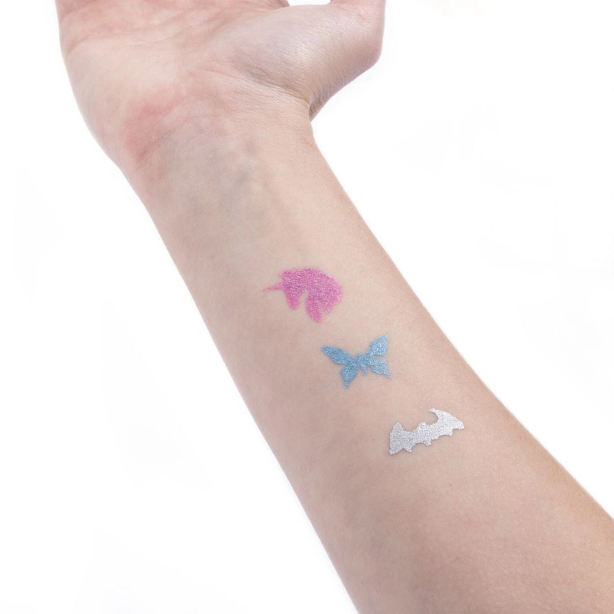 Brokatowe markery do tauażu Kidea odmienią image razem! Zestaw zawiera aż 12 szablonów, dzięki którym wykonasz perfekcyjny tatuaż oraz 3 brokatowe markery (różowy, niebieski, srebrny) o niezwykłych metalicznych kolorach. Wystarczy przyłożyć szablon w dowolne miejsca na skórze i pokolorować.