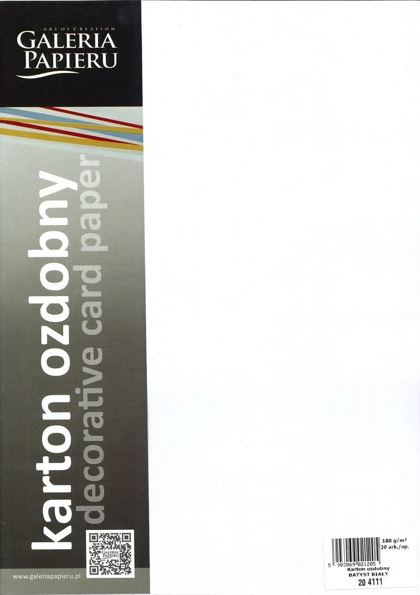 Karton ozdobny Batyst, metalizowany dwustronnie z tłoczeniem przypominającym tkaninę batystową, format: A4, gramatura: 220g/m2, ilość: 20 arkuszy w opakowaniu, kolor perłowej bieli, polecany do drukarek laserowych, EAN: 5903069021205Format: A4Gramatura: 180Kod Producenta: 204111Kolor: białyseria: batyst biały.