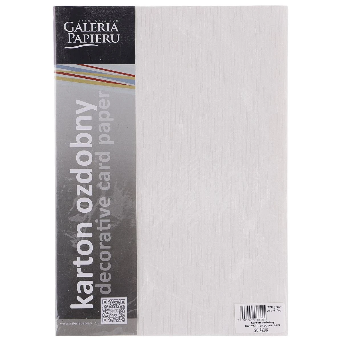 Karton ozdobny Batyst, metalizowany dwustronnie z tłoczeniem przypominającym tkaninę, format: A4, gramatura: 220g/m2, ilość: 20 arkuszy w opakowaniu, kolor perłowej bieli, polecany do drukarek laserowych, Karton do przygotowania zaproszeń, dyplomów, wizytówek, kartek okolicznościowych, EAN: 5903069028525Format: A4Gramatura: 220Kod Producenta: 204203Kolor: białyseria: batyst perłowa biel.