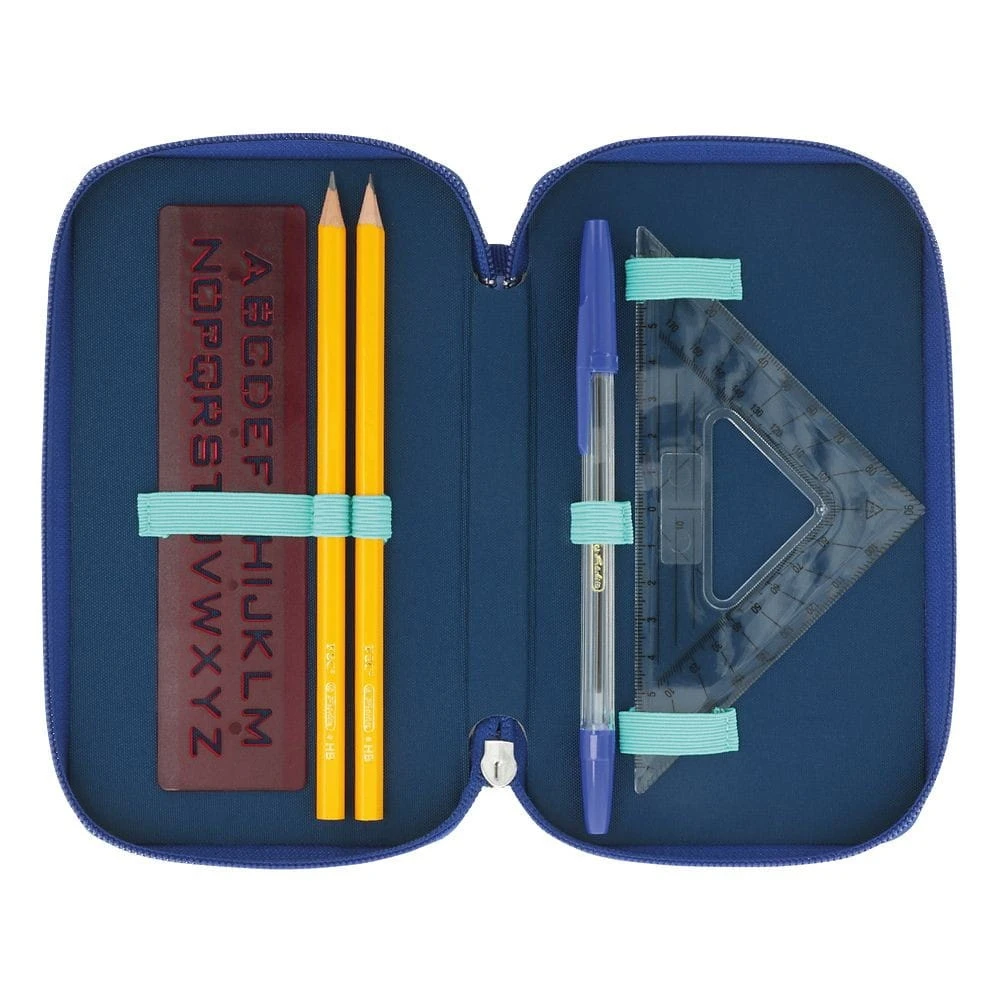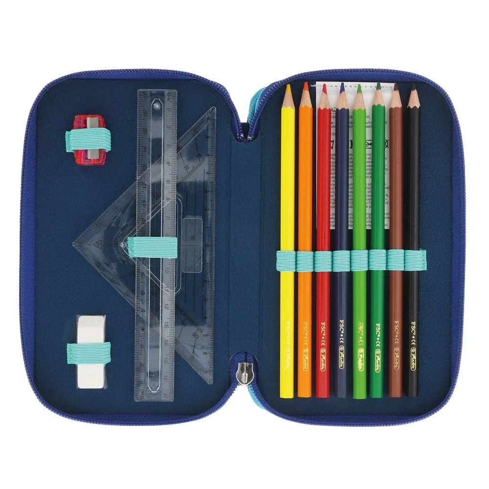 Piórnik potrójny z wyposażeniem 31 części3 komory zapinane na zamek błyskawiczny.szerokość: 19 cm, wysokość: 11,5 cm, grubość: 7 cm EAN: 4008110371962Ilość komór: 3Kod Producenta: 300001560Kolekcja: nieb/turkusseria: 31 cz.