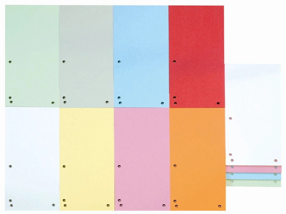 -wykonane z kartonu o gramaturze 190gsm-do wpinania w pionie oraz w poziomie-dziurkowanie: 4 (dziurki w odstępie 80mm)-rozmiar przekładki: 235x105mm-100 sztuk w j.s.