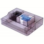 -przybornik na biurko, z jeżem, wykonany z transparentnego polistyrenu odpornego na pęknięcia-1 przegroda (97x81mm) na karteczki (w komplecie ok. 300 sztuk)-1 przegroda na artykuły piszącejeż? (62x80mm )-1 przegroda na artykuły piśmienne, linijkę (223x15mm )-1 przegroda na drobne artykuły biurowe: klipy, pinezki, spinacze (62x80mm)-1 przegroda na większe artykuły biurowe: rozszywasz, mały zszywacz, dziurkacz (151x60mm)-3 przegrody na drobne artykuły biurowe (gumka, temperówka, dodatkowe grafity, itp.