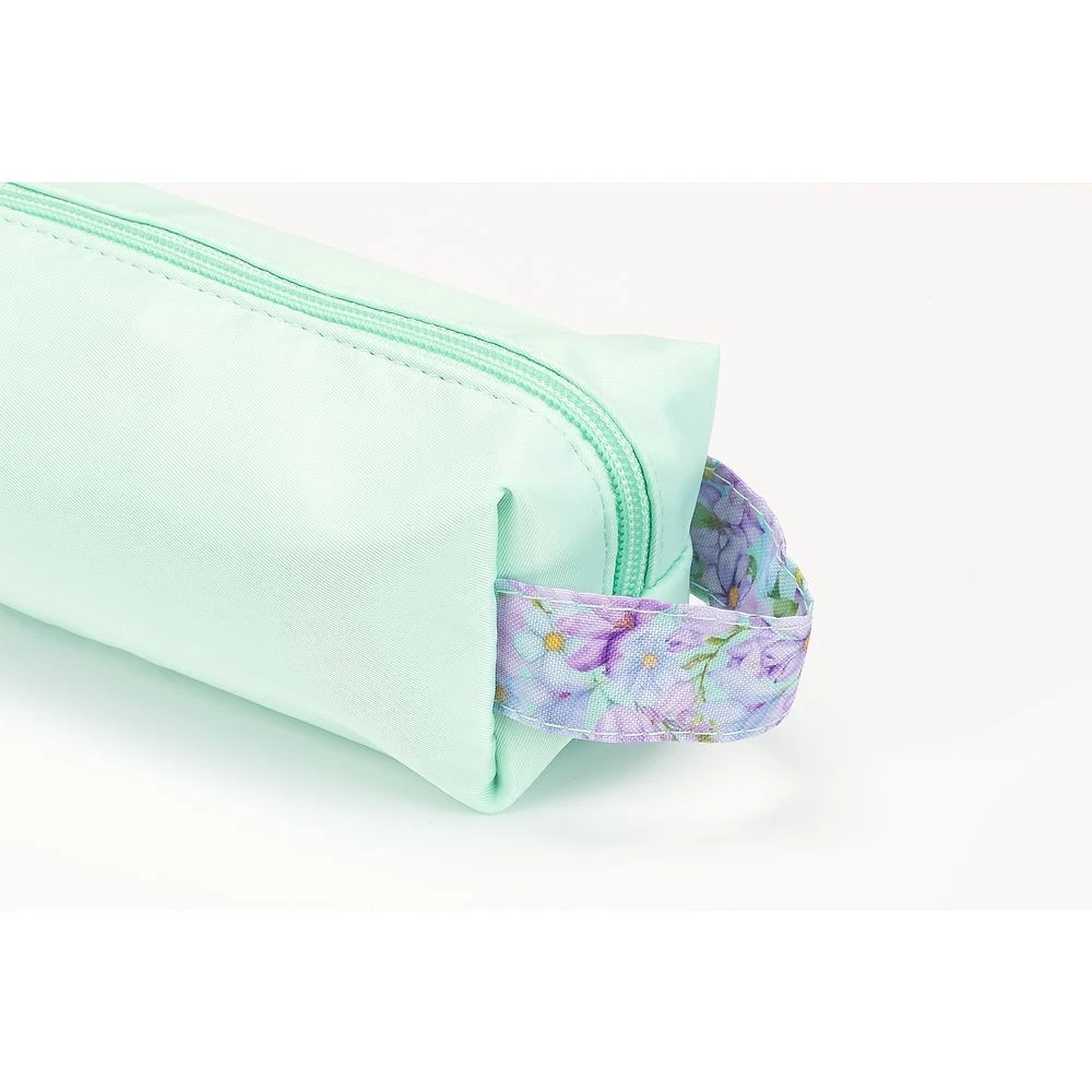 Materiałowy uchwyt na końcu piórnika umożliwia jego łatwe przenoszenie i daje możliwość powieszenia go na wieszaku