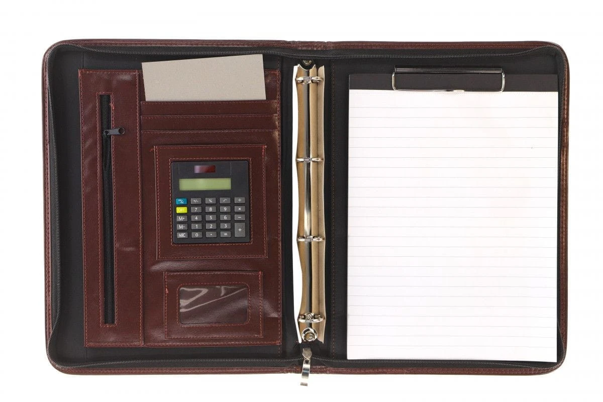 Wymiary: 260x340 mm, materiał: skóra ekologiczna, gumka na długopis, kieszonka na wizytówkę, posiada ring, kalkulator w komplecie, kieszenie na dokumenty, zasuwana kieszonka, klips z notesem w linię, zamykana na suwak EAN: 5904210054950Format: A4Kod Producenta: 709Kolekcja: z kalkulatoremKolor: brązowyseria: A4Surowiec: ekoskóra.