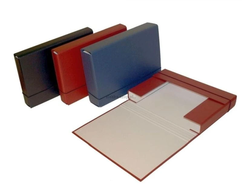 Wykonana ze sztywnej tektury 1,7 lub 2 mm oklejonej z dwóch stron elegancką okleiną. Szerokość grzbietu 6 cm .