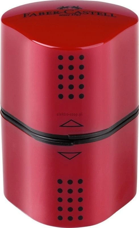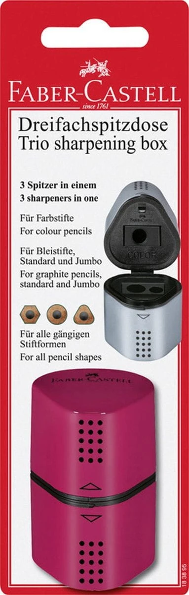 Temperówka 3 w 1 Trio Faber-Castell w kolorze czerwonym lub niebieskim z pojemnikiem na ostrużyny. Przeznaczona do klasycznych i trójkątnych kredek i ołówków w standardowym rozmiarze i Jumbo.