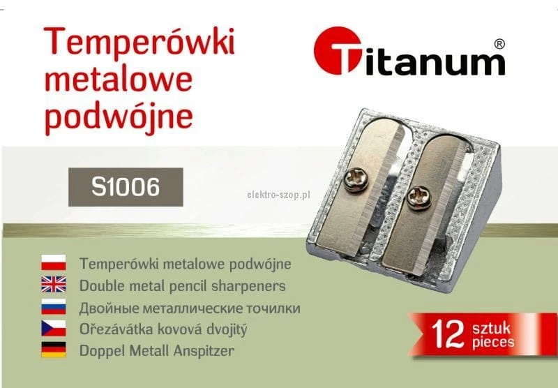 Aluminiowa temperówka. Dwa ostrza: do ołówków i kredek standardowych oraz jumbo.