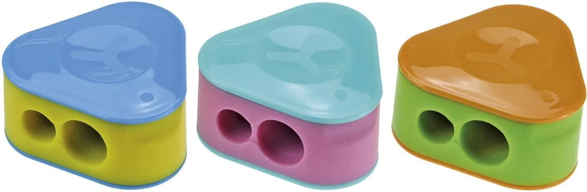 Plastikowe, trójkątne temperówki. Z dwoma otworami o średnicy 7mm i 10 mm.