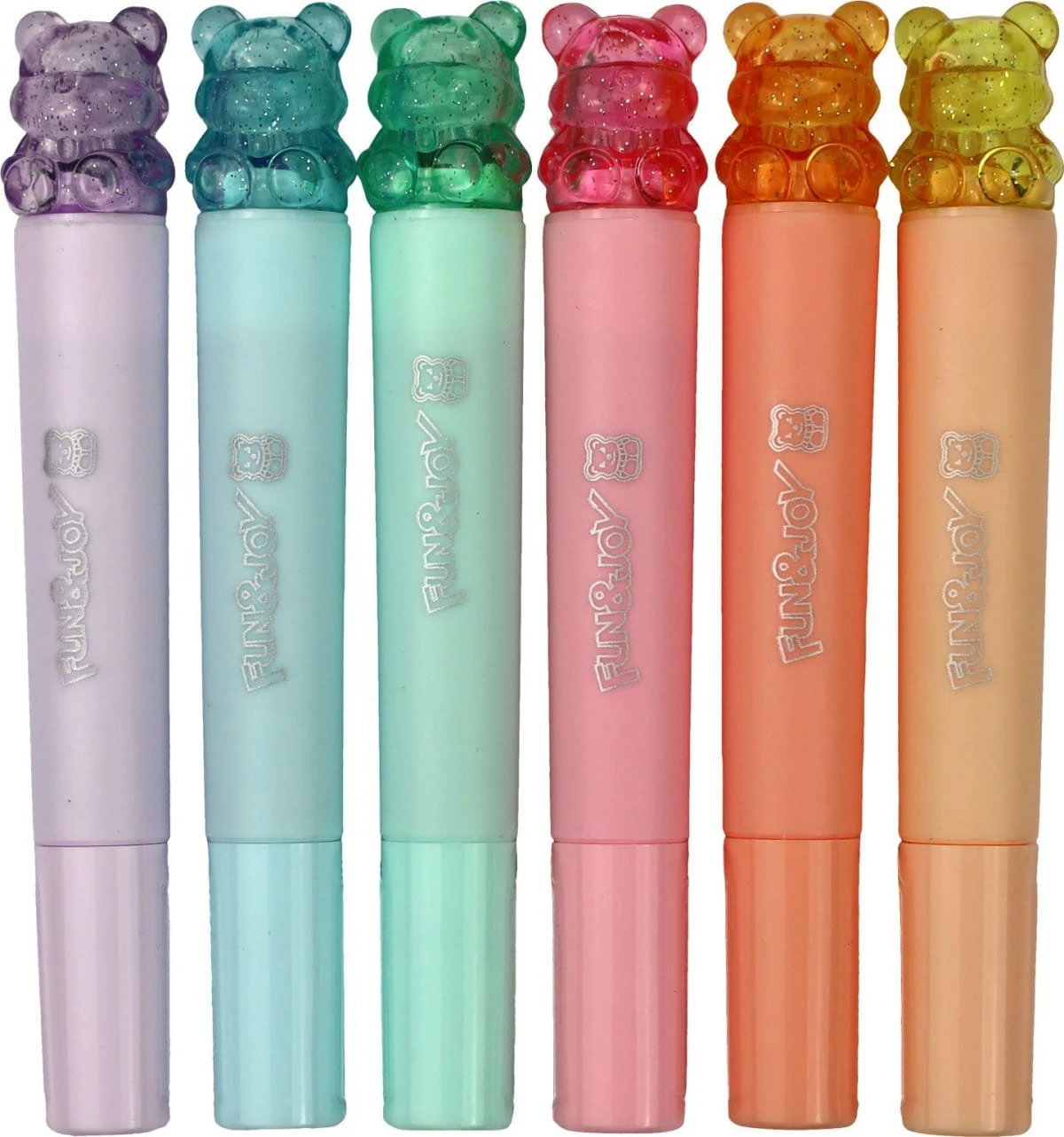 Zestaw 6 zakreślaczy z pieczątkami w rozmiarze mini. Okrągła obudowa zakończona słodkim przeźroczystym misiem w kolorze tuszu.