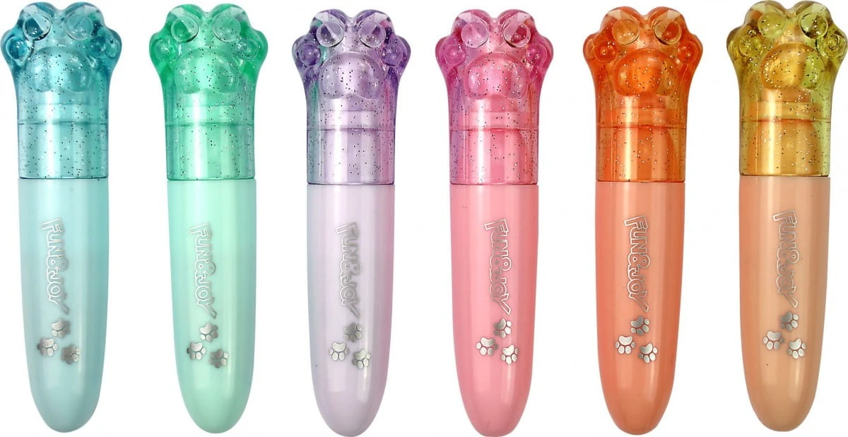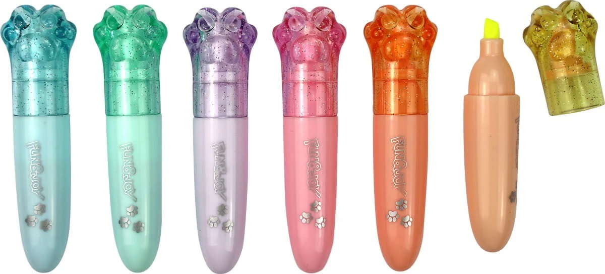Zestaw 6 zakreślaczy w rozmiarze mini. Okrągła obudowa zakończona słodką przeźroczystą łapką w kolorze tuszu.