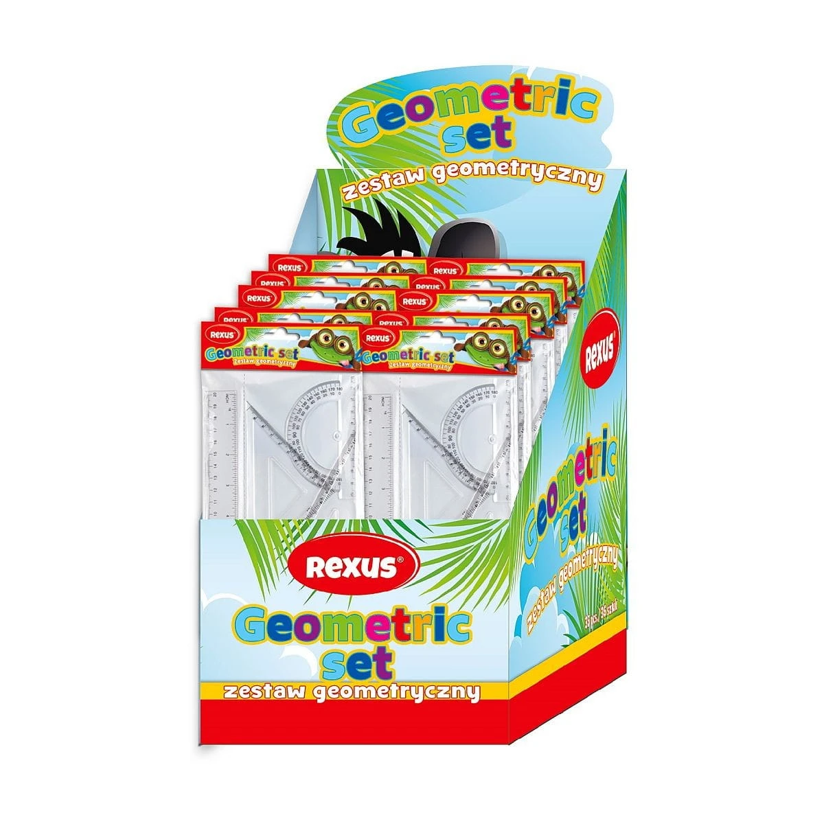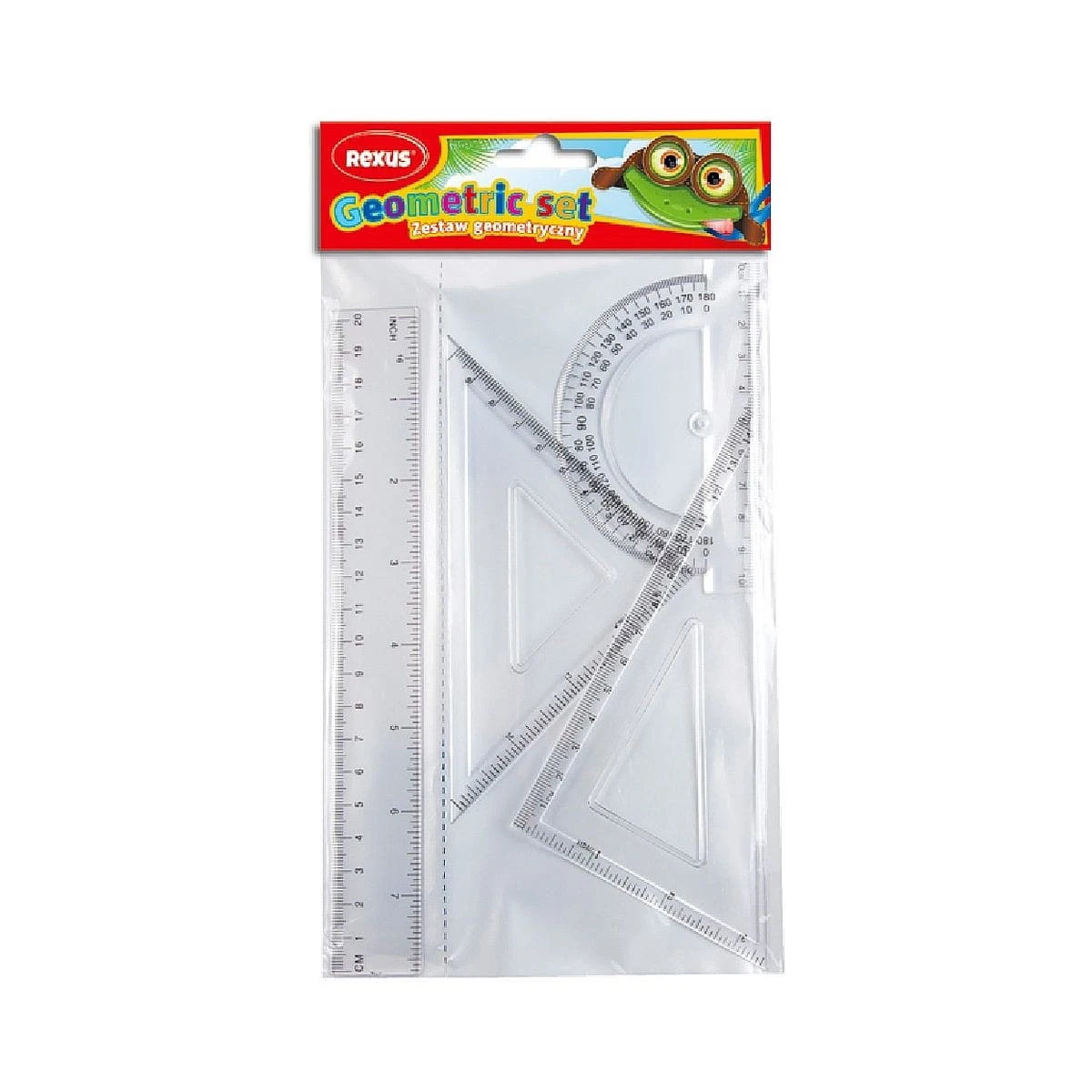 Zestaw podstawowych przydatnych przyrządów geometryczno/kreślarskich. Wszystkie elementy wykonane z przezroczystego plastiku z czarnym nadrukiem.